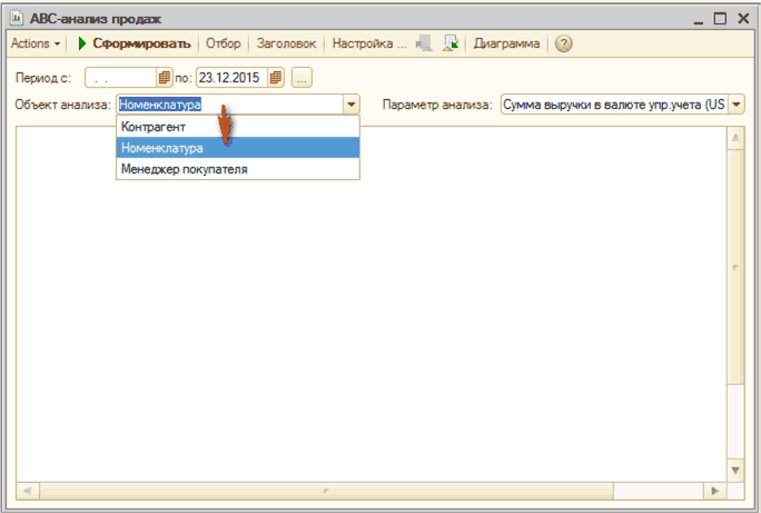 Параметры для построения отчета задаются в реквизите «Параметр анализа». Отчет можно строить по следующим параметрам: