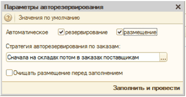 Параметры резервирования и размещения могут быть заполнены автоматически. По кнопке «Заполнить и провести» в верхней части документа можно перейти в настройки автоматического размещения и резервирования заказанных товаров. Система предупредит пользователя , что документ будет работать в оперативном режиме - т. е., если документ будет проведен, то в базе тут же товар будет, например, зарезервирован и станет недоступен для других заказов. Менеджер может выбрать режимы: « Автоматическое резервирование » и «Автоматическое размещение».
