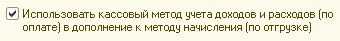 Основной метод учета доходов и расходов в программном продукте - метод начисления (по отгрузке). Тем не менее, дополнительно, может применяться кассовый метод учета доходов и расходов (по оплате). Учет доходов и расходов кассовым методом ведется в разрезе направлений деятельности, направлений списания и источников поступления денежных средств .