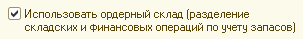 Параметр "Использовать ордерный склад (разделение складских и финансовых операций по учету запасов)" определяет возможность разделить учет запасов на складской и финансовый. Этот параметр находится в разделе конфигурации "Сервис и администрирование" / Панель действий / Группа команд "Настройка параметров" / Команда "Настройка параметров учета" / Раздел "Склад и производство". При первом запуске программы возможность использования ордерного склада выключена. Для использования данной возможности необходимо установить в настройках параметров учета соответствующий флажок.