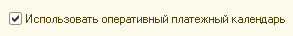 Параметр "Использовать оперативный платежный календарь " определяет возможность ведения платежного календаря - инструмента для оперативно планирования расхода, поступления и перемещения денежных средств. Этот параметр находится в разделе конфигурации "Сервис и администрирование" / Панель действий / Группа команд "Настройка параметров" / Команда "Настройка параметров учета" / Раздел "Прочие разделы". При первом запуске программы возможность ведения платежного календаря выключена. Для использования данной возможности необходимо установить в настройках параметров учета соответствующий флажок.