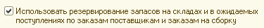 Параметр "Использовать резервирование запасов на складах и в ожидаемых поступлениях по заказам поставщикам и заказам на сборку" определяет возможность резервирования запасов на складах, учета материальных и других прямых затрат в производстве по заказам покупателей, размещение заказов покупателей в открытых заказах поставщикам и заказам на производство (сборку, разборку). Этот параметр находится в разделе конфигурации "Сервис и администрирование" / Панель действий / Группа команд "Настройка параметров" / Команда "Настройка параметров учета" / Раздел "Снабжение и закупки". При первом запуске программы возможность резервирования и размещения запасов выключена. Для использования данной возможности необходимо установить в настройках параметров учета соответствующий флажок.