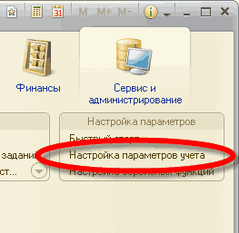 - перейти в раздел конфигурации "Сервис и администрирование " / Панель действий / Группа команд "Настройка параметров", выполнить команду " Настройка параметров учета ";