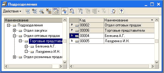 В справочнике Подразделения регистрируем новую группу Торговые представители. Эта группа должна входить в состав того отдела (подразделения), в котором реально работают торговые представители. В эту группу в качестве новых подразделений регистрируем торговых представителей.