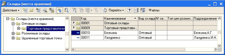 В справочнике Склады также создаем группу Торговые представители и каждого торгового представителя регистрируем, как отдельный склад.