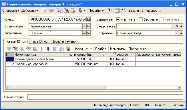 Передача товаров торговым представителям оформляется документом Перемещение товаров. В качестве склада выбирается тот торговый представитель, которому передается товар.