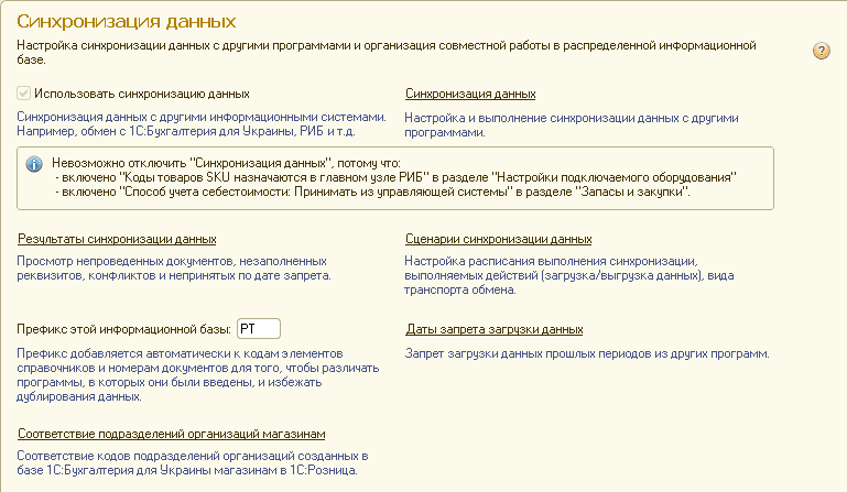 Использование обмена данными определяется в настройках синхронизации данных (пункт Синхронизация данных в панели навигации раздела Настройка и администрирование). В форменастройки синхронизации данных установите флаг Использовать синхронизацию данных, задайте Префикс информационной базы.