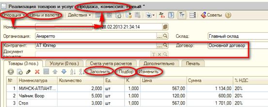 Состоянием флагов окна "Цены и валюта"определяется смысл значений, которые содержаться в реквизитах"Цена" и "Сумма". В реквизитах "% НДС" и "Сумма НДС" хранятся параметры обложения НДС-ом всех номенклатурных позиций. Значения вышеописанных реквизитов в большинстве случаев заполняются автоматически. Конечная стоимость всего объема каждой номенклатурной позиции отражается в информационном реквизите "Всего". А конечная сумма по документу (по закладкам "Товары" и "Услуги") и сумма НДС документа отражается в нижней части документа.