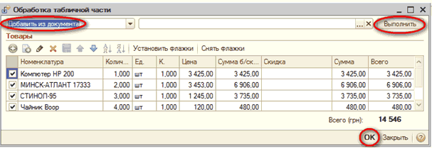 Внесение измен в реквизитах табличной части делаются по всем позициям, которые помечены флажками. Вызывая, обработку в ее список переносятся и выделяются все позиции из табличной части документа. По кнопке "Выполнить" исполняется выбранное пользователем действие. Для того чтоб перенести результаты групповой обработки в табличную часть документа нужно нажать кнопку "ОК", чтоб не сохранять изменения нажимаем кнопку "Закрыть".