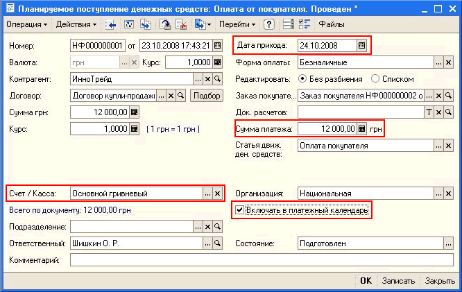 Если "Планируемое поступление" проведено в рамках "Заказа покупателя" и включено в платежный календарь, то такой заказ считается оплаченным покупателем. Товары в рамках такого заказа могут быть отгружены, даже если договором предусмотрена 100%-ная предоплата и деньги фактически не поступили. Такой подход объясняется именно тем, что включение "Планируемого получения денежных средств" в платежный календарь обозначает полное доверие к покупателю; не поступление от него денежных средств в указанный срок может объясняться только независящими от него причинами и не должно влиять на отношения с ним.