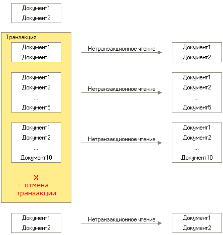 Наглядным проявлением этой особенности может служить запись в транзакции большого количества новых документов и последующая отмена этой транзакции. Если в процессе выполнения такой транзакции в другой сессии 1С:Предприятия открыть список создаваемых документов, то можно увидеть, что по мере выполнения кода создаются новые документы, а после отмены транзакции все созданные документы будут удалены. Так происходит потому, что данные в динамических списках читаются в нетранзакционном режиме, в результате чего, несмотря на то, что транзакция активна, незафиксированные изменения, выполненные в этой транзакции, будут видны другим приложениям 1С:Предприятия :