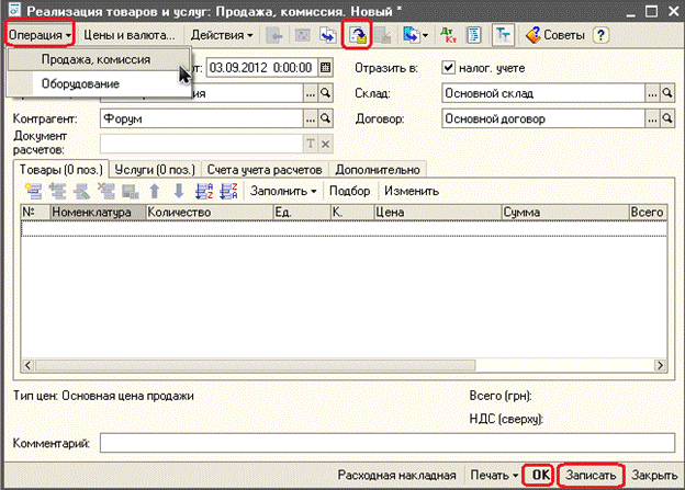 Например, документ "Реализация товаров и услуг" предназначен для регистрации трех видов хозяйственных операций: продажа, комиссия и оборудования.