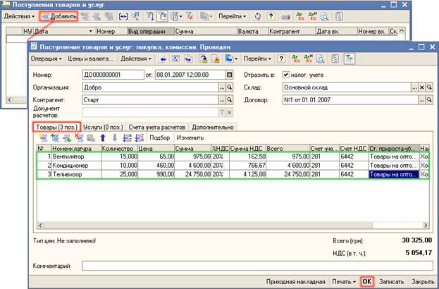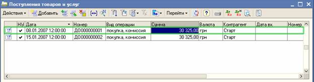 Чтобы создать новый документ "Поступление товаров и услуг" с установленным видом операции покупка, комиссия, нужно нажать экранную кнопку