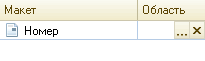 После чего, в добавленной строке, в поле ввода колонки "Область" нажать кнопку выбора. При этом табличный документ с макетом перейдет в режим выбора области. Выберем ячейку, в которой будем располагать макет поля и нажмем клавишу Enter.