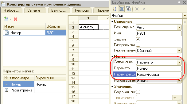 В свойствах ячейки области (свойства вызываются при помощи сочетания клавиш Ctrl+Enter) укажем, что мы хотим выводить в этой ячейке параметр, укажем имя параметра Номер и укажем имя параметра расшифровки Расшифровка.
