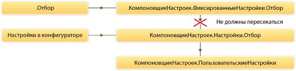 При этом если отбор по одному и тому же полю одновременно присутствует в коллекциях Настройки.Отбор и ФиксированныеНастройки.Отбор, то возникает ошибка времени выполнения "Невозможно применить фиксированные настройки. Пересекаются элементы отбора".