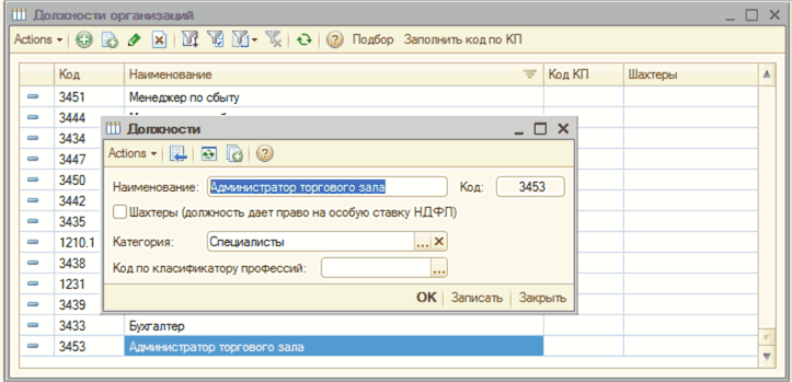 Перечень должностей предприятия хранится в справочнике « Должности организаций », который можно заполнить из классификатора профессий, поставляемого вместе с конфигурацией.