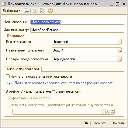 Макс. база профсоюзного взноса – предел, свыше которого удержание не производится. Это общий (или «Для подразделения») показатель схем мотивации с порядком ввода показателя «Периодически».