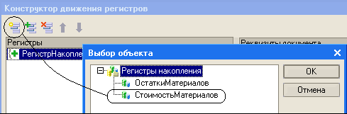 - запустим конструктор движений документа и добавим в список регистров регистр СтоимостьМатериалов;