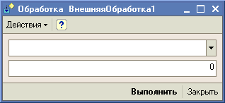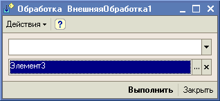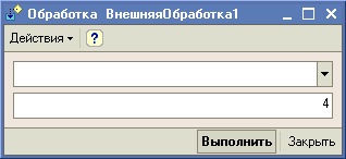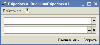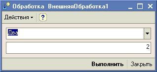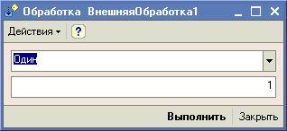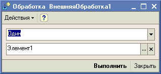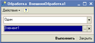 В правой колонке - внешний вид второй формы внешней обработки. В ней размещены поле выбора и поле ввода; они оба связаны с реквизитом внешней обработки Реквизит1 по данным. Приведем текст модуля формы:
