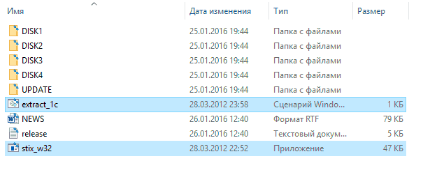 Шаг 1. Извлечь из архива два файла extract_1c.cmd и stix_w32.exe в каталог установки обновления.