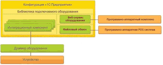 Оборудование подключается к системе с помощью драйвера, разработанного по технологии создания внешних компонент . Технология определяет интерфейс взаимодействия между платформой и драйвером. Реализация драйвера возможна по технологии создания внешних компонент с использованием стандартных компонентных объектов для Windows (COM-интерфейс) и собственной технологии фирмы 1С – NativeAPI (динамическая библиотека для Windows или Linux). С помощью технологии NativeAPI можно создавать внешние компоненты, которые могут подключаться как в клиентском приложении , так и на сервере " 1С:Предприятия ", в том числе и в версиях для Linux.