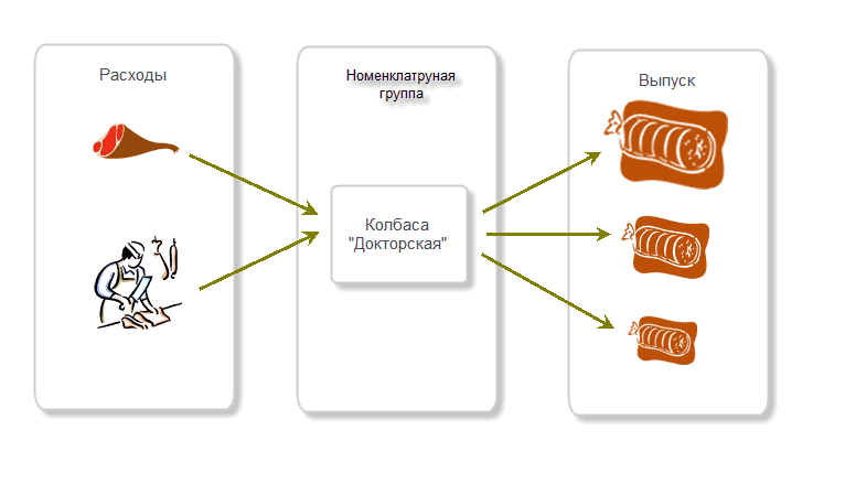 Например, плановая себестоимость производства колбасы "Докторская" высшего сорта - 50 грн., первого сорта - 45 грн., второго сорта - 40 грн. Для калькулирования фактической себестоимости каждого наименования выпуска в справочнике номенклатурных групп следует указывать один элемент "Колбаса "Докторская"".