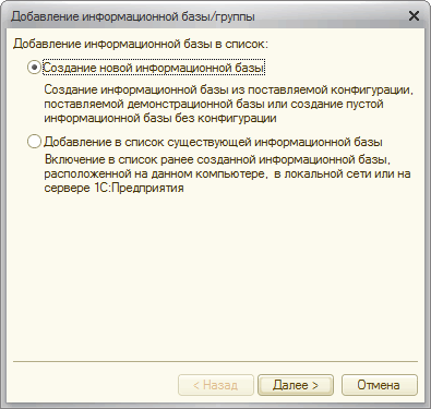Выбираем "Создание новой информационной базы". Далее выбираем необходимую конфигурацию.