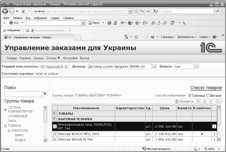 Товары представлены в списке иерархически по группам номенклатуры. Клиент может осуществлять навигацию по группам с помощью специального управляющего элемента – дерева групп товаров, расположенного в левой части формы или непосредственно с помощью таблицы или детализированного списка товаров. В таблице навигация осуществляется двойным щелчком мыши на строках групп номенклатуры, а в детализированном списке – щелчком на гиперссылке соответствующей группы.
