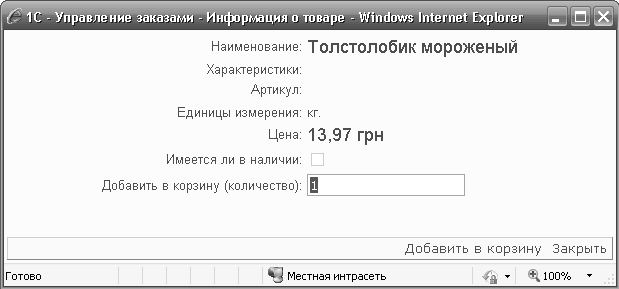 Окно детализации по товару отображает более подробную информацию о товаре и также позволяет добавить товар в «корзину покупателя».