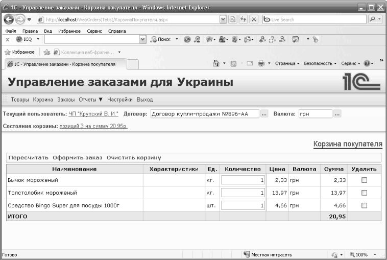 Для этого необходимо использовать управляющие элементы непосредственно в таблице позиций «корзины покупателя» а затем нажать кнопку «Пересчитать» в командной панели данной формы. Клиент может полностью очистить корзину, нажав кнопку «Очистить корзину».
