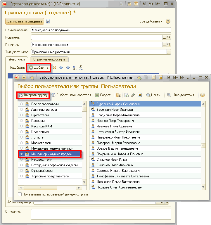 На странице Участники необходимо указать список менеджеров по продажам, которые будут относиться к данной группе доступа. В рассматриваемом примере настраиваемые права доступа будут распространяться на всех менеджеров по продажам, поэтому удобно указывать не конкретных пользователей, а группу пользователей .